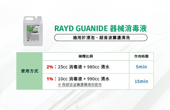 手術用器械預泡消毒 使用方式 器械使用完畢後,以2%的稀釋比例【清水:濃縮液=1000cc:20cc】稀釋藥水,將醫材與稀釋藥水一同放入消毒用容器中,浸泡15分鐘之後用清水洗淨